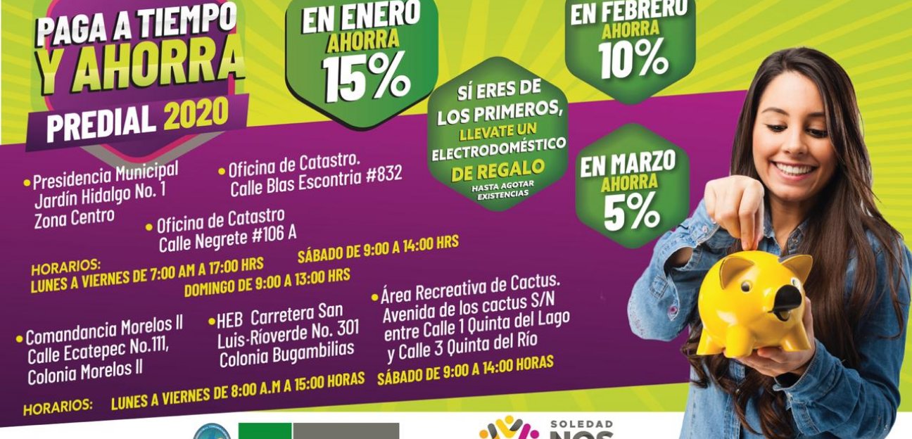 El Ayuntamiento de Soledad a través de la Dirección de Desarrollo Urbano y Catastro Municipal, iniciará este 2 de enero de 2020 el Programa de Descuentos del Impuesto Predial dirigido a contribuyentes cumplidos, a quienes además se les hará entrega de un electrodoméstico como incentivo.