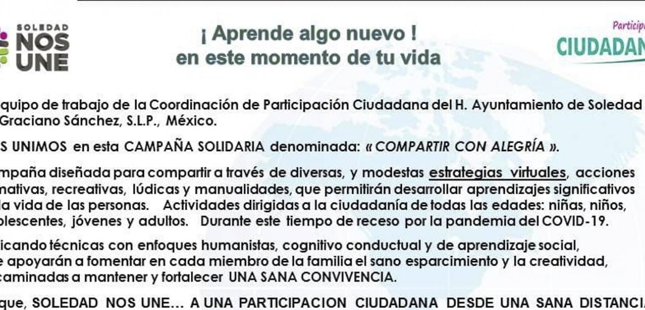 La Coordinación de Participación Ciudadana del Ayuntamiento de Soledad, se une a la campaña solidaria “Compartir con alegría”, un programa diseñado de acompañamiento social a través de diversas estrategias virtuales, en las que se realizan múltiples actividades recreativas y de aprendizaje.