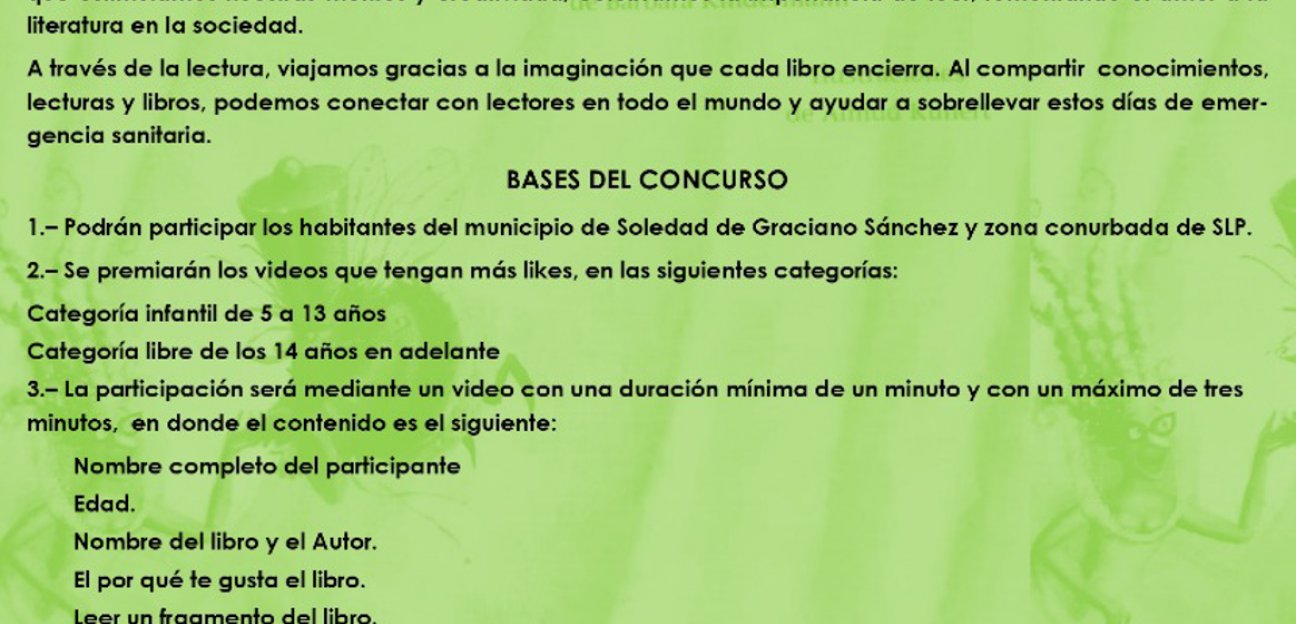Puntualizó que la participación será mediante un video con una duración mínima de un minuto y un máximo de tres, donde se lea un fragmento de un libro y se explique el motivo por el cual escogió el fragmento, debiéndose enviar los videos vía Messenger o inbox a la página de Facebook Bibliotecas Soledad de Graciano Sánchez y los resultados se darán a conocer el 23 de abril del presente año.