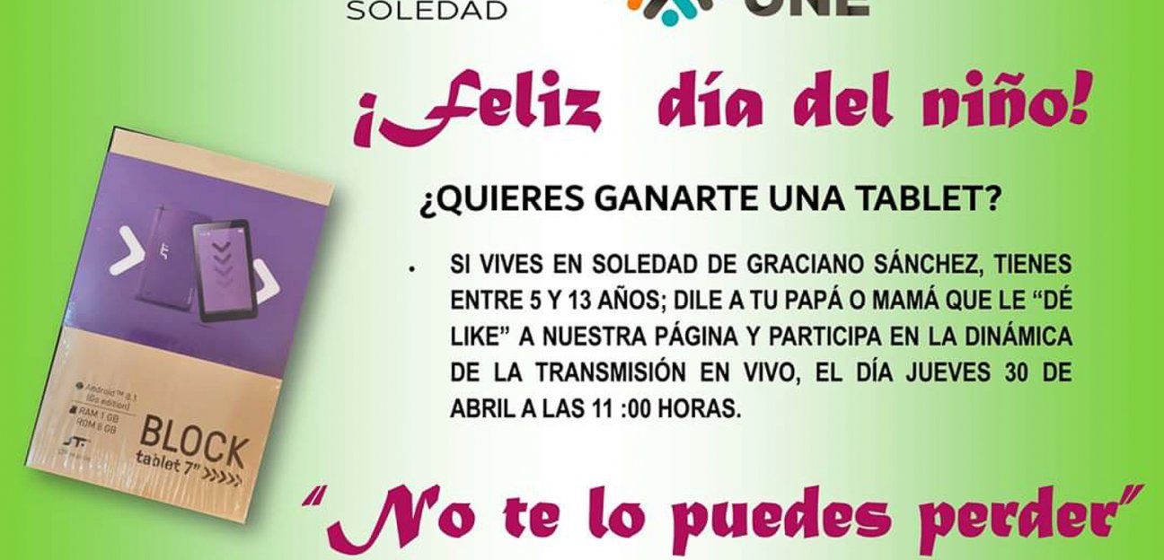 Con motivo de la celebración del Día del Niño este jueves 30 de abril, la Coordinación Municipal de Bibliotecas de Soledad, invita a niños a participar en una dinámica durante una transmisión en vivo desde su página de Facebook, para que puedan ganar una tableta electrónica.
