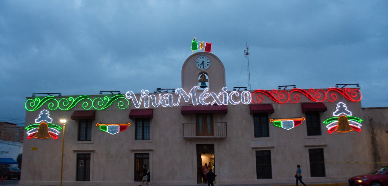 La dirección de Servicios Municipales colocó estructuras y adornos alusivos a los festejos patrios en el exterior de la presidencia municipal.