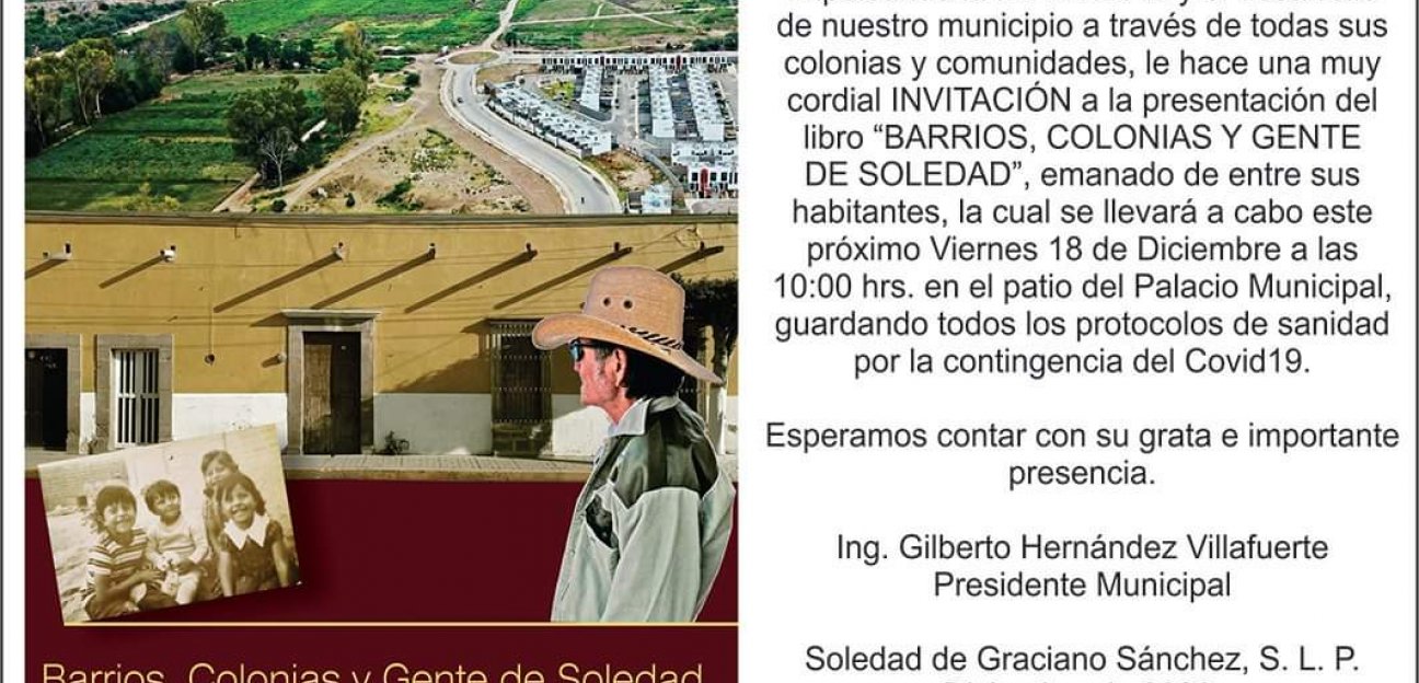 El libro “Barrios, Colonias y Gente de Soledad”, importante investigación histórica y sociodemográfica, será presentado el próximo viernes en Palacio Municipal, como parte del proyecto del Ayuntamiento de Soledad por promover el orgullo y preservar la identidad soledense.
