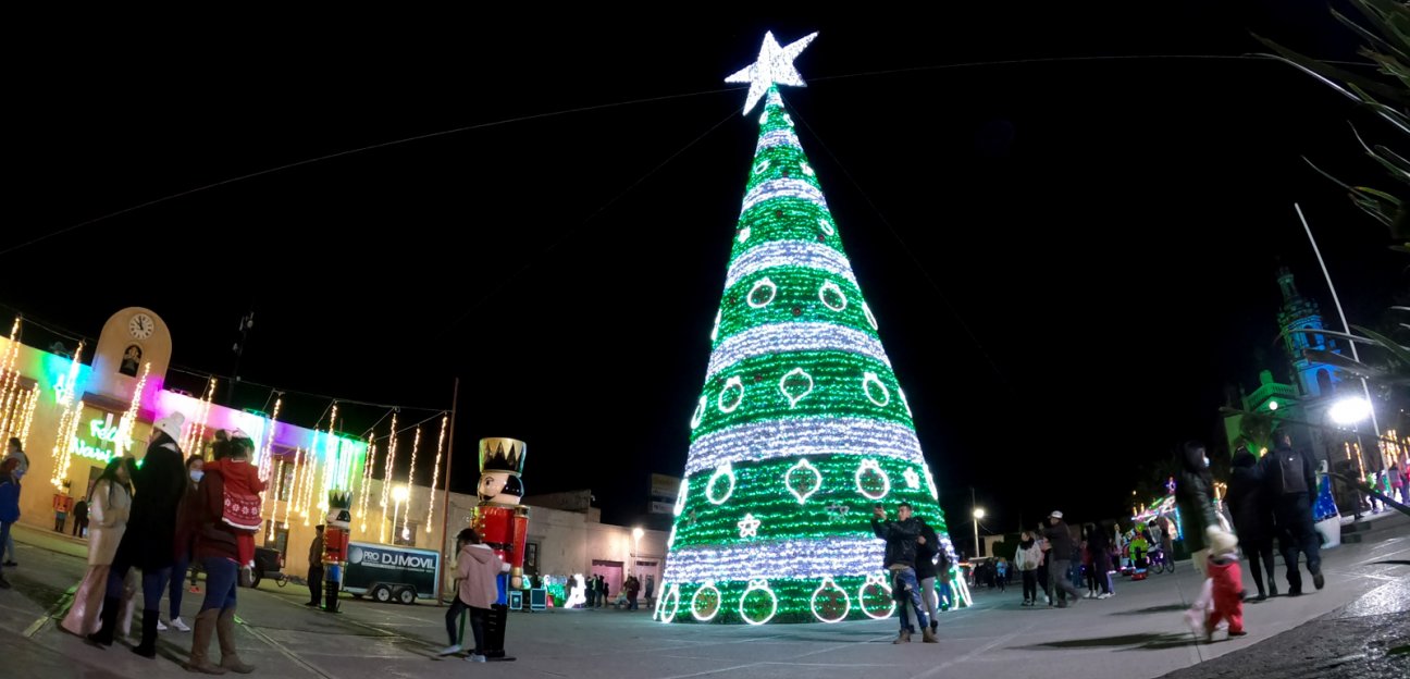 El Ayuntamiento de Soledad ofrece un espacio seguro y apegado a las medidas sanitarias, para que las familias disfruten del espectáculo visual navideño, que recrea en la plaza principal una viña con estructuras que dan forma a figuras alusivas de esta época, además del monumental pino de 30 metros de altura.