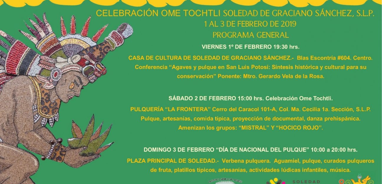 Las actividades iniciarán el día 1 de febrero en punto de las 19:30 horas en la Casa de Cultura de Soledad “Bicentenario y Centenario de la Nación”, en donde en su sala y galería principal se llevará a cabo la conferencia “Agaves y pulque en San Luis Potosí: Síntesis histórica y cultural para su conservación” impartida por el Mtro. Gerardo Vela de la Rosa integrante del Colectivo Pulquero “El cariño de un Tlacuache” de San Luis Potosí.