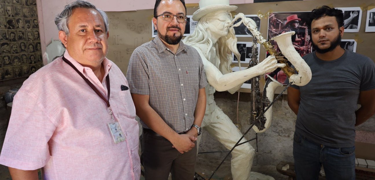 El alcalde de Soledad, Gerardo Zapata Rosales, acompañado del director de Cultura Municipal, Roberto Posadas Martínez, supervisó los avances de la escultura que se crea en honor al músico Eulalio Cervantes Galarza "Sax".
