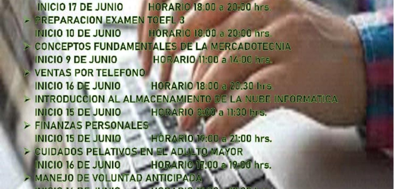 Los cursos son los siguientes: Peinado y trenzado para niñas: inicio 14 de junio de 09:00 a 11:00 horas; Vocabulario y expresiones básicas del idioma inglés: inicio 17 de junio, de 18:00 a 20:00 horas; Preparación examen TOEFL 3: inicio 10 de junio, de 18:00 a 20:00 horas; Conceptos fundamentales de la mercadotecnia: inicio 9 de junio, de 11:00 a 14:00 horas; Ventas por teléfono: inicio 16 de junio, de 18:00 a 20:30 horas; Introducción al almacenamiento de la nube informática: inicio 15 de junio, de 08:00 a 11:30 horas y Finanzas personales, que inicia el 15 de junio, de 19:00 a 21:00 horas.