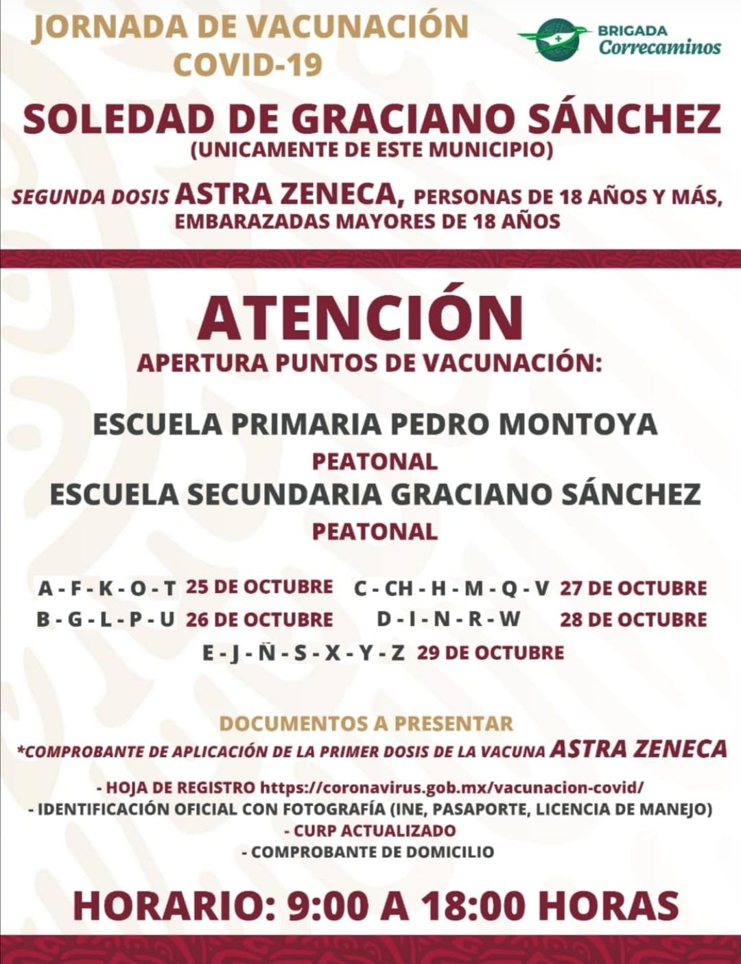 El horario de aplicación de la vacuna será de 9:00 de la mañana a 18:00 horas, por ello el Ayuntamiento de Soledad de Graciano Sánchez invita a los soledenses a participar en esta jornada de vacunación y acudir con los documentos necesarios para su inoculación entre los que se encuentra él comprobante de la primera dosis de vacunación con Astra Zeneca, la hoja de registro ante el portal del gobierno federal, tener identificación oficial con fotografía y CURP actualizada.