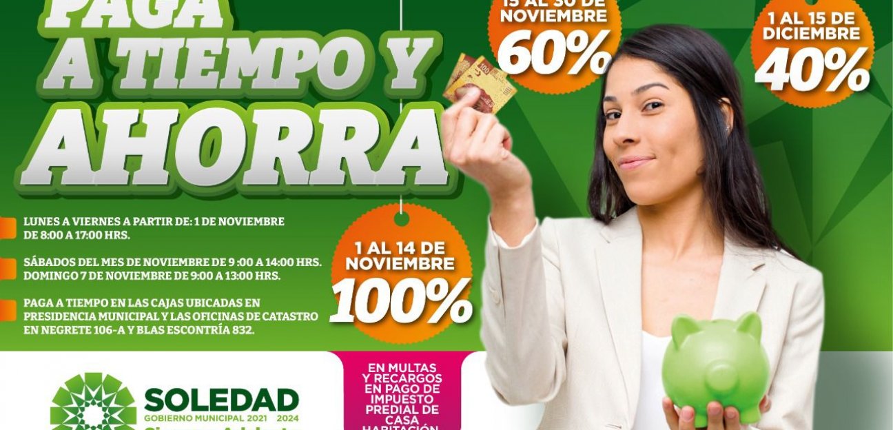 Soledad de Graciano Sánchez, SLP.-Por instrucciones de la alcaldesa de Soledad, Leonor Noyola, y a fin de beneficiar la economía de las familias del municipio, la dirección de Catastro pondrá en marcha el programa “Ahorra y Gana con Tu Predial” el cual iniciará a partir de este lunes primero de noviembre, y ofrecerá descuentos en multas y recargos sobre dicho impuesto.