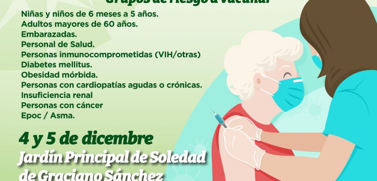 Soledad de Graciano Sánchez; SLP.- La Plaza Principal de Soledad de Graciano Sánchez será sede de la próxima campaña de vacunación contra la influenza que se realizará este próximo 4 y 5 de diciembre.