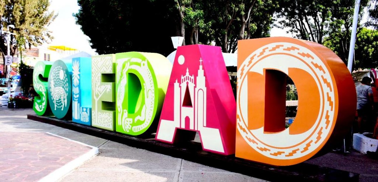 Las letras que forman la palabra “Soledad” son de distintos y vistosos colores, con figuras en blanco de imágenes que representan algunos aspectos de nuestra riqueza cultural como sus monumentos, flora y fauna.
